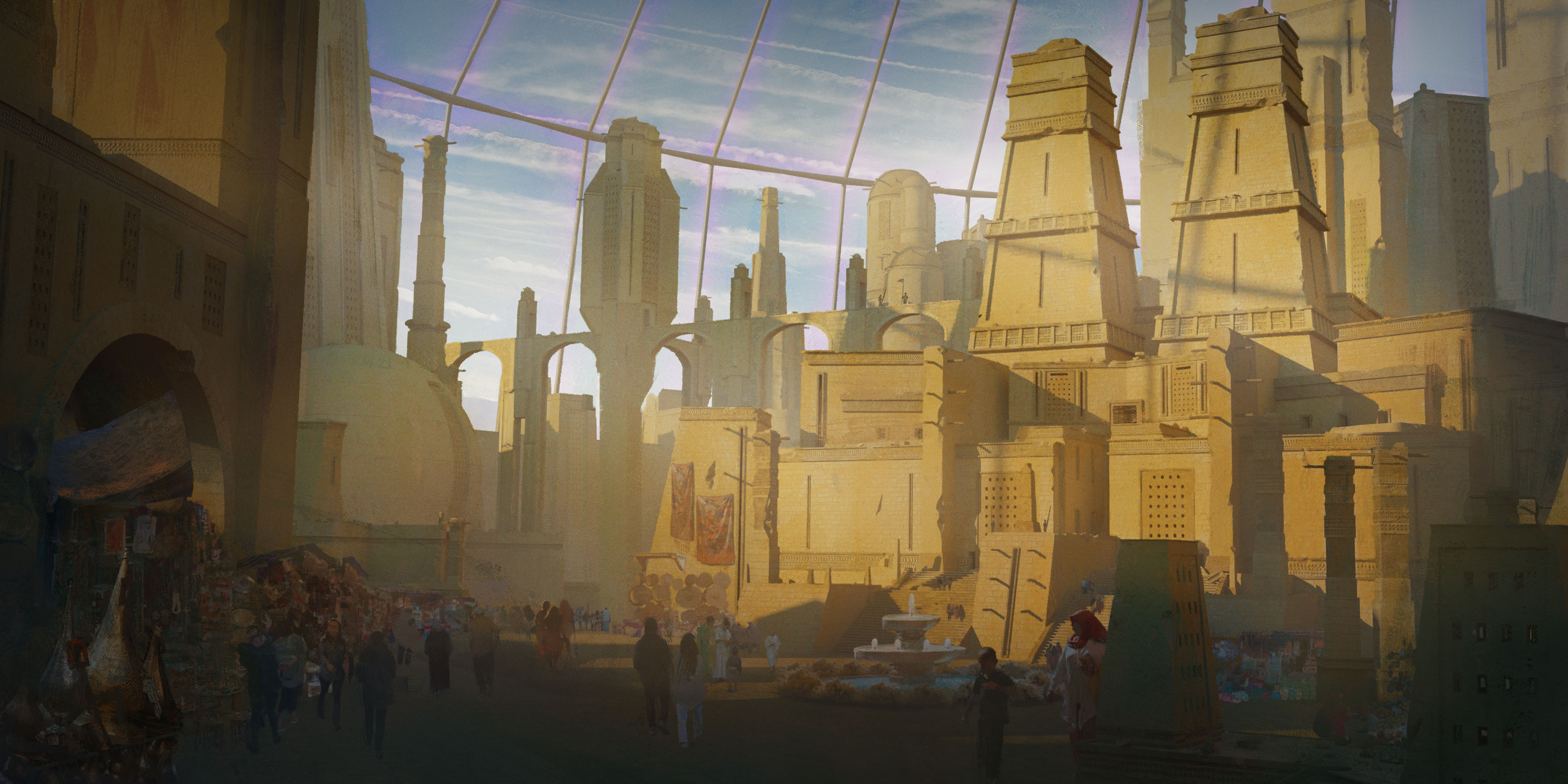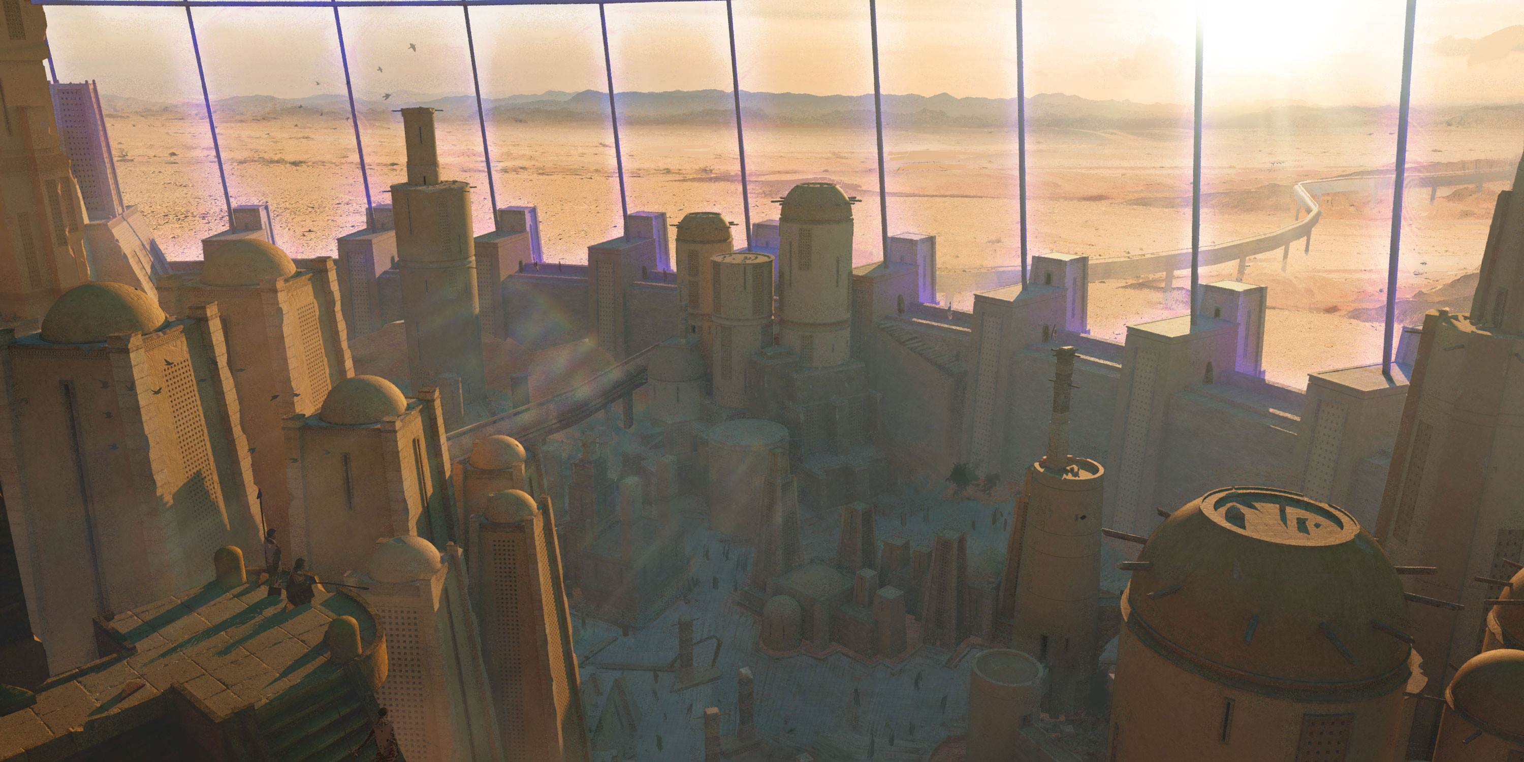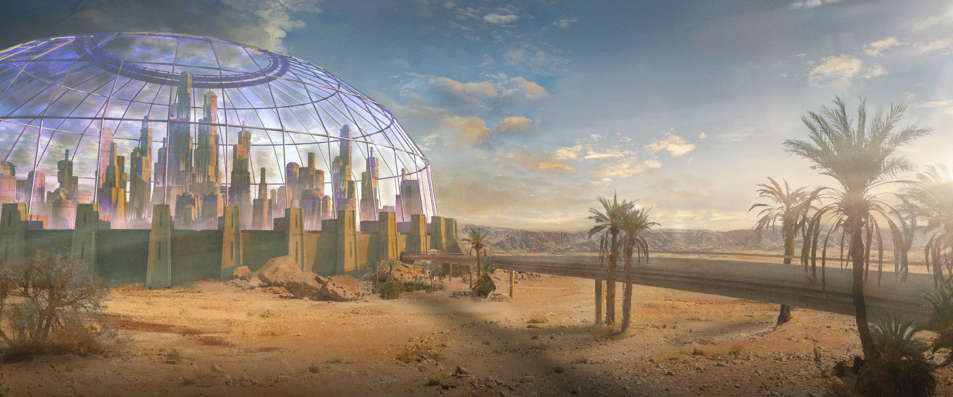 An environment created for Swordsfall's world of Tikor, this time venturing out into the Vinyata Desert. I used Cinema 4D and Photoshop for this one, designing a new environment that showcases the enormous dome sheltering the city and the walls built to protect its people from whatever lurks beyond the safety of the city limits. It was a great opportunity to think about worldbuilding through environment design, how architecture and scale can tell a story about the world and the lives of the people within it.