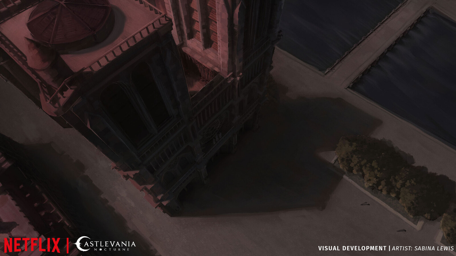 Visual development for Castlevania: Nocturne Season 2 at Powerhouse Animation Studios, covering the Paris Marais district and Notre Dame for the show's dramatic final episode. The defining challenge was the red sky casting over the entire environment. I had to find the balance between pushing that intense, apocalyptic light while keeping it from tipping too pink and losing its impact. Getting that colour balance right was key to making the environments feel as dramatic as the moment they were built for.
