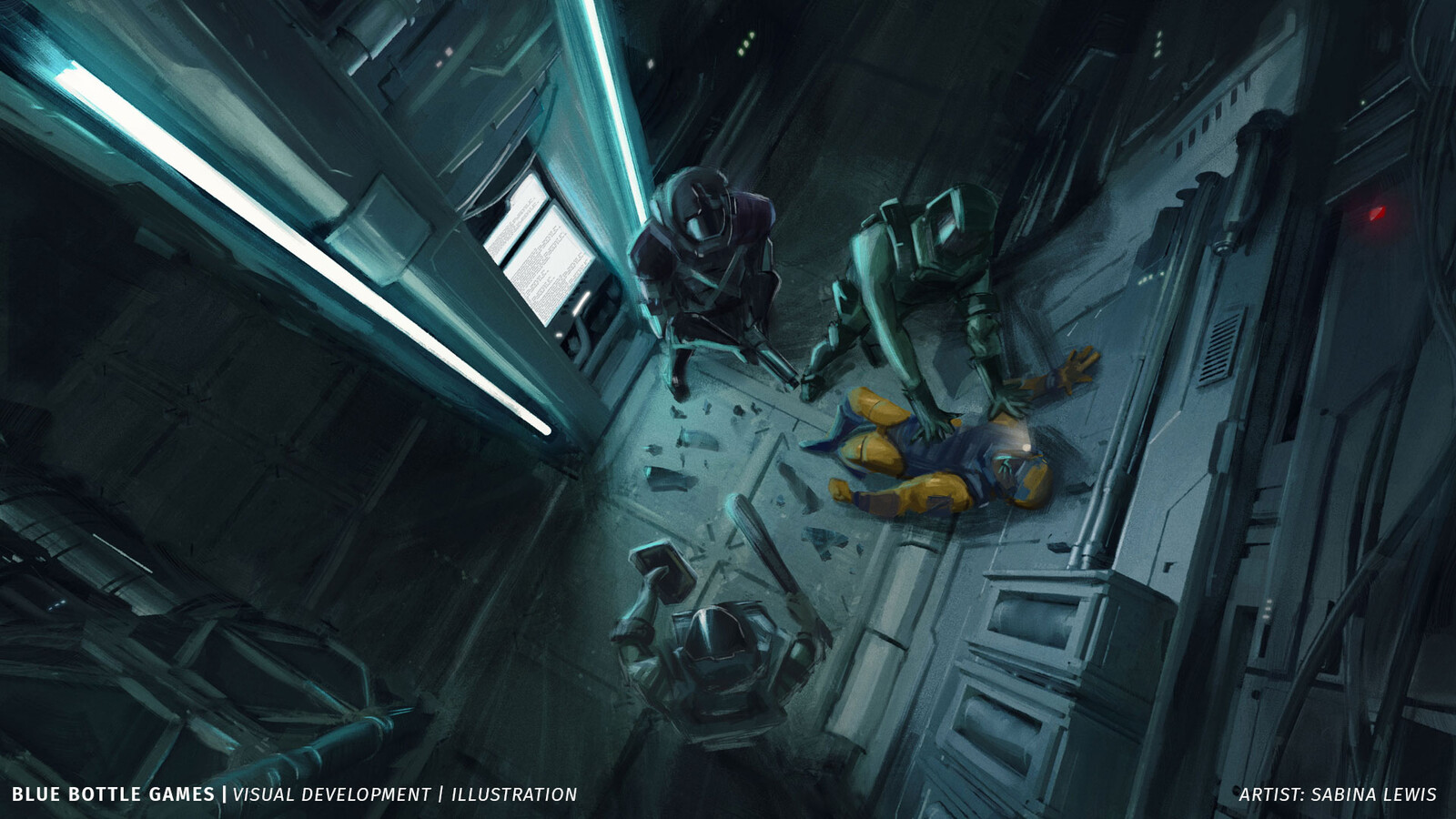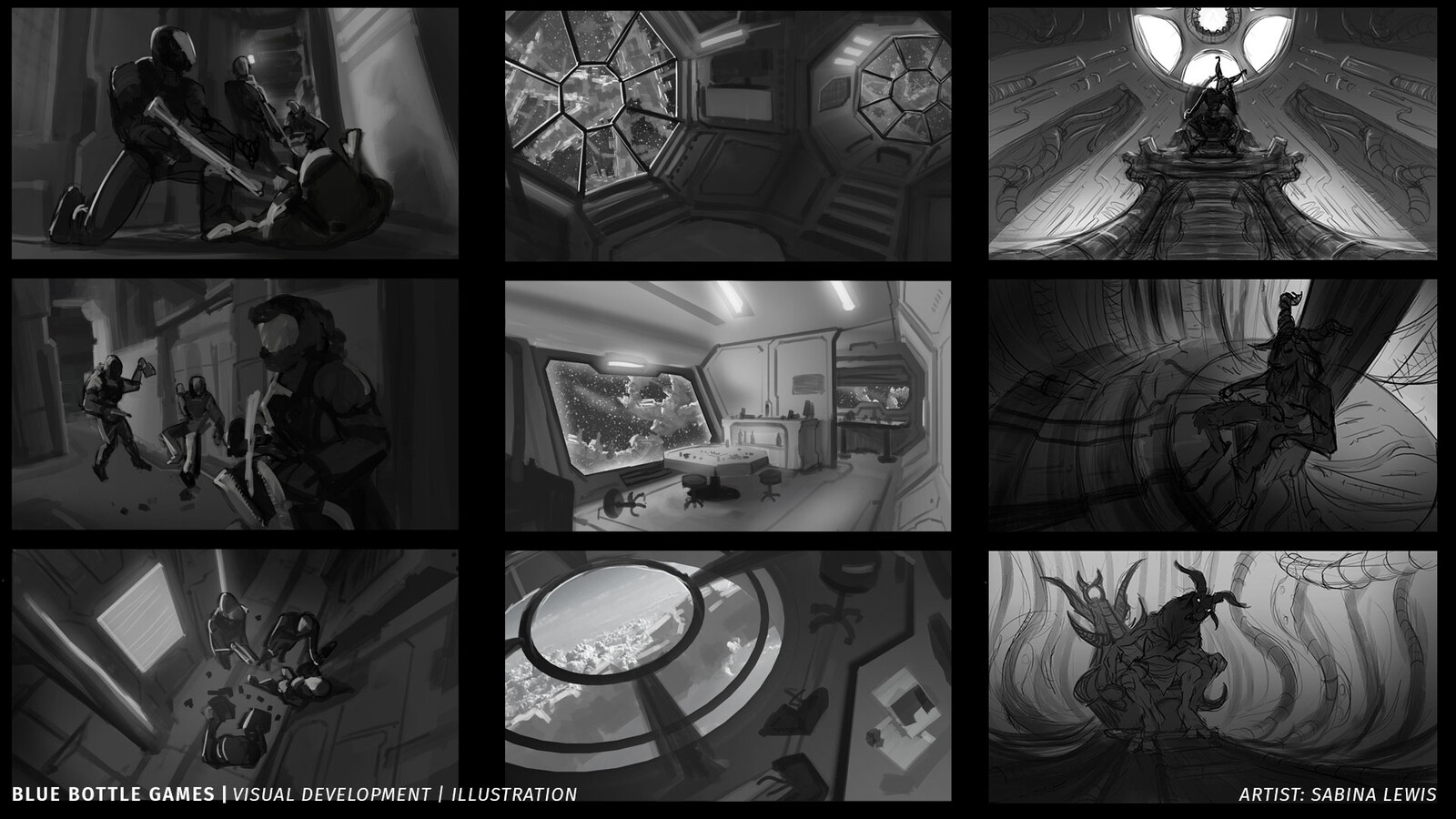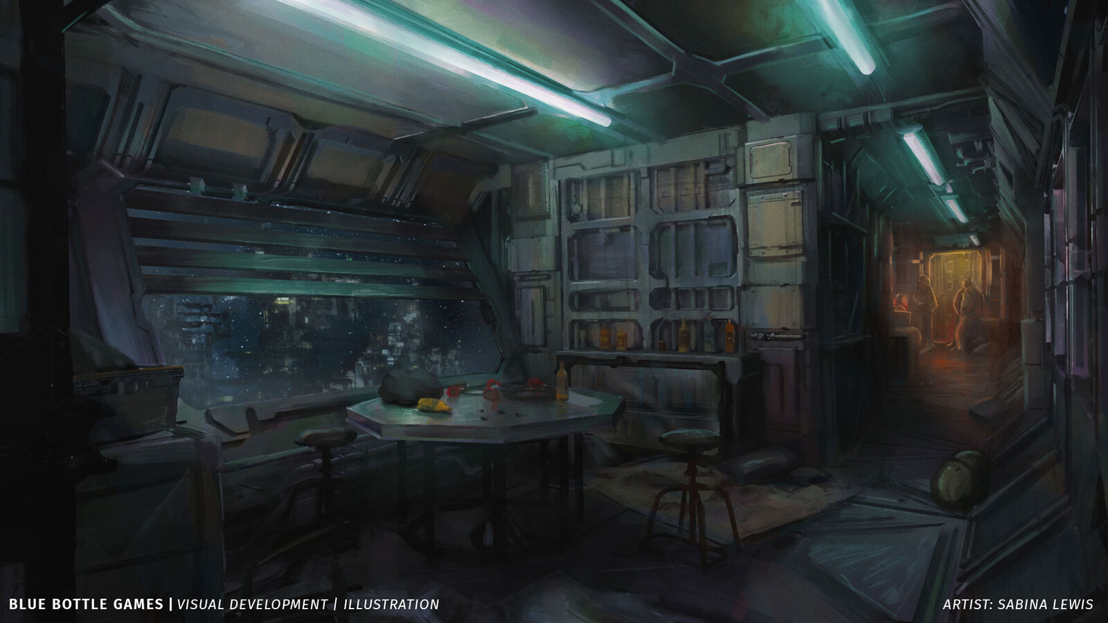 Visual development and illustration work for Blue Bottom Games' indie game Ostranauts. My process moved back and forth between 2D and 3D, starting with thumbnail sketches to nail down the design, then into Blender to block things out, a quick drawover to work through anything that needed resolving, then back into Blender to refine the blockout and add textures. From there, I rendered and polished, finishing with a paintover to bring in the colour, lighting and atmosphere.