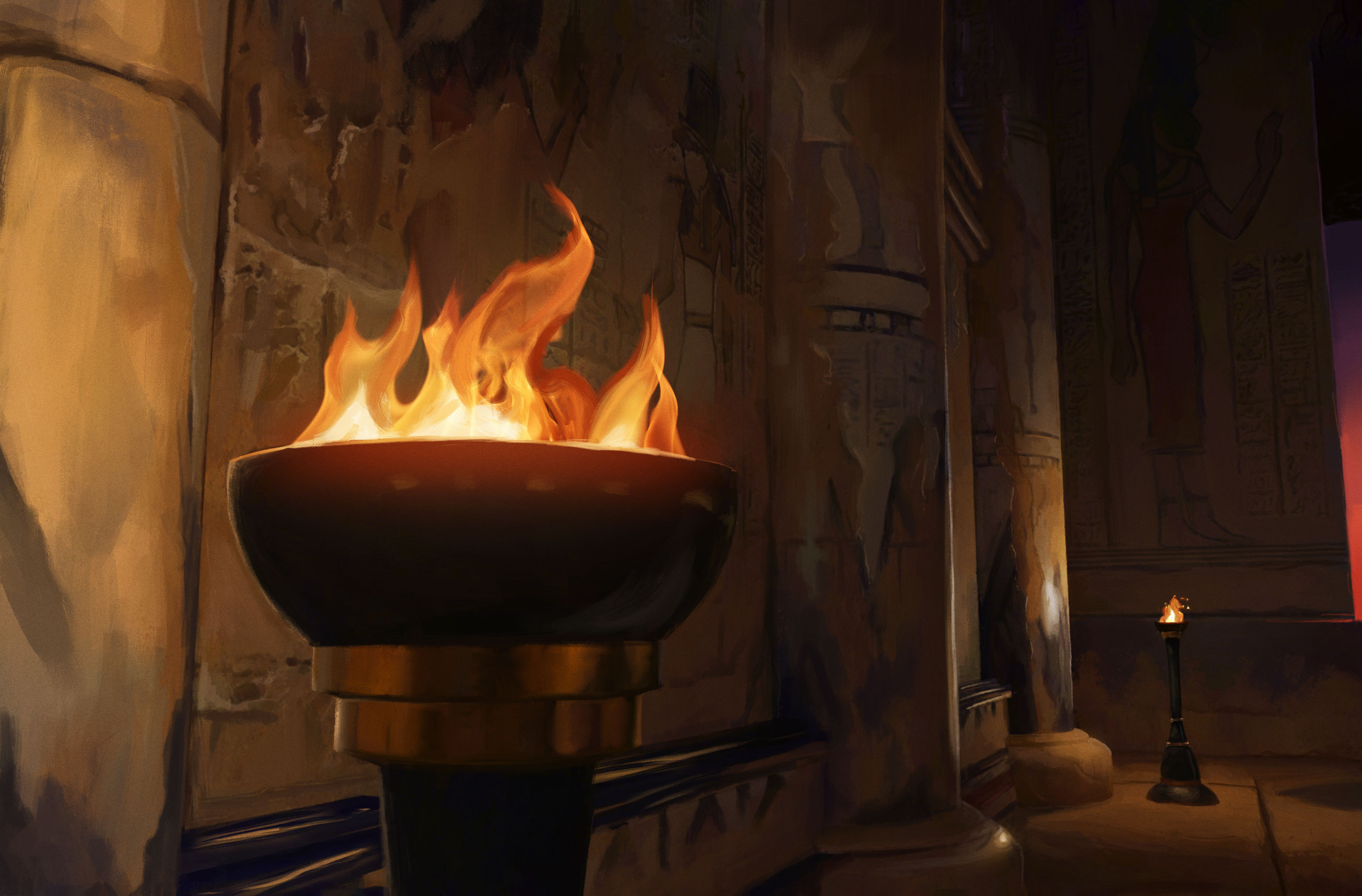 Environment paintover for Castlevania: Nocturne Season 2 at Powerhouse Animation Studios, working over a 3D model created by Sam Keiser. My job was to bring the space to life through lighting and atmosphere. I built the mood around firelight, letting it cast dramatic shadows and give the temple that eerie, unsettling edge. I also added sand shapes on the floor to help guide the composition and give the eye somewhere to travel through the scene.